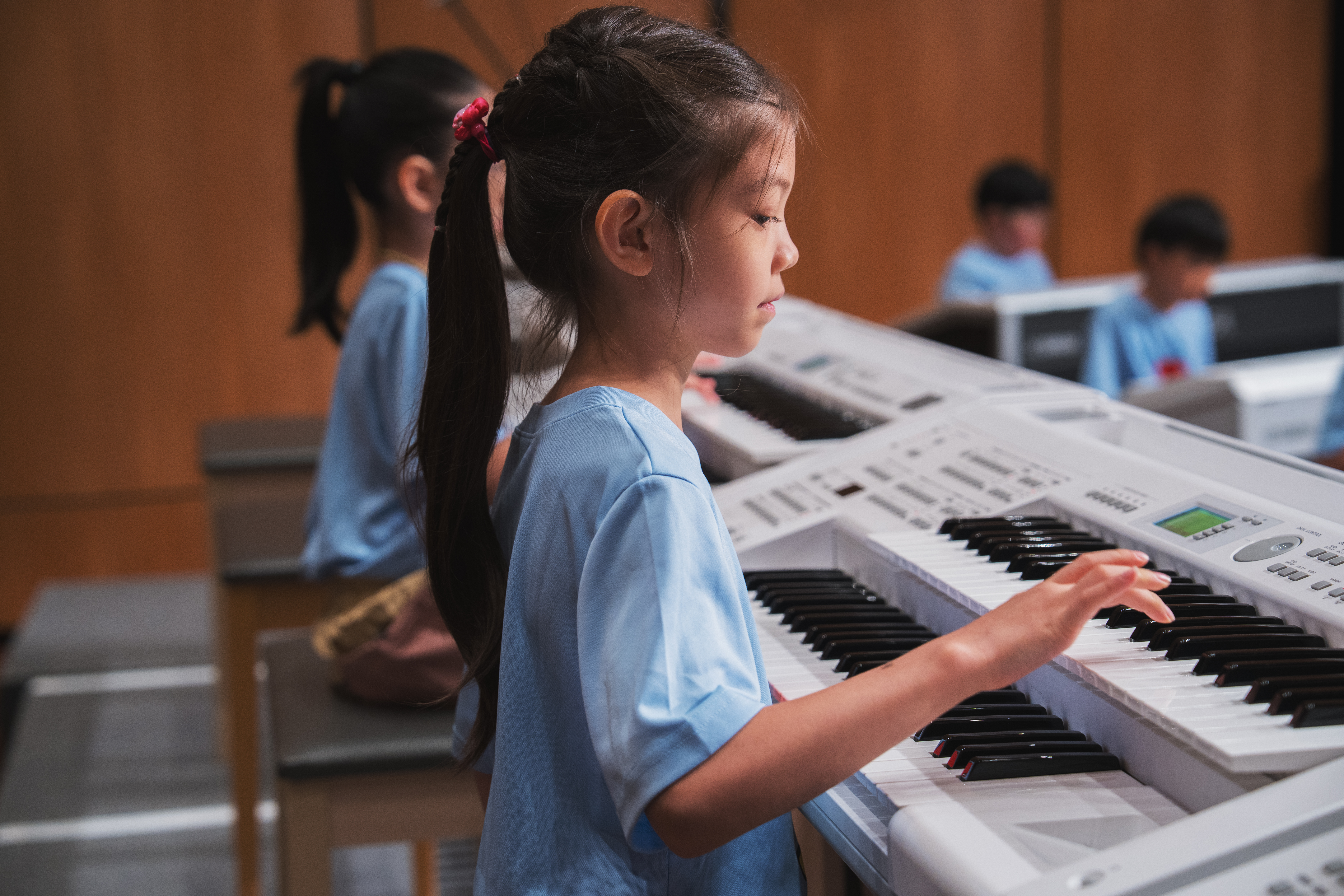 兒童期的孩子手指的運動神經已經完全發育,因此,只要促進演奏的慾望便能讓孩子自動自發地去彈奏。然而,在兒童班裡不非僅僅重視彈奏能力,我們同樣重視聽音能力、讀譜能力、與豐富情感的培育。