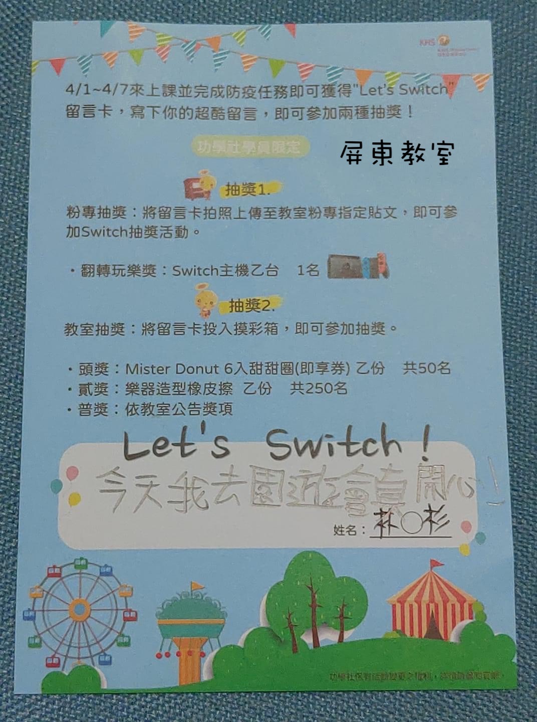 將留言卡拍照上傳至教室粉專指定貼文,即可參加Switch抽獎活動。