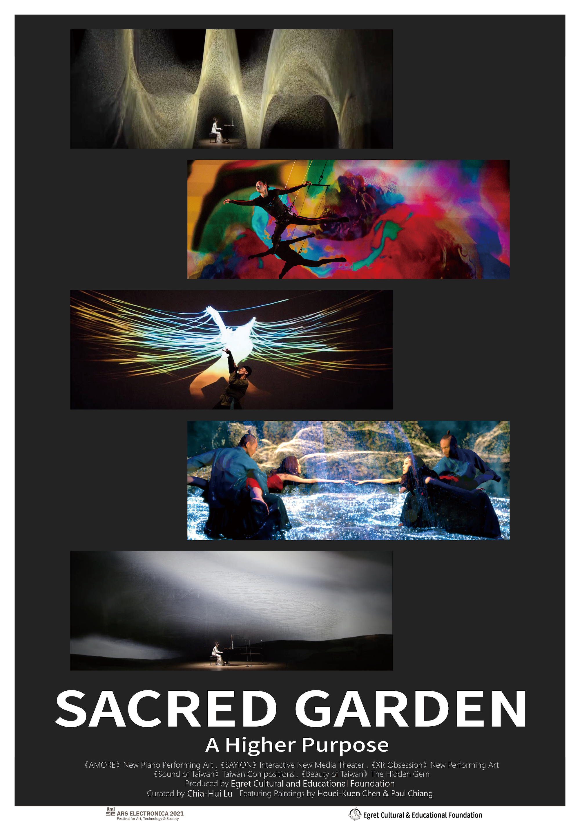 歐洲歷史悠久的(42年)林茲奧地利電子藝術節,因疫情關係,今年第二年採線上全球展演,2021 9/8-12,為期五天,共100多個國家與單位線上全球展演,臺灣的白鷺鷥基金會即將參加推播五大節目,命名為「神聖花園」,共五節目。