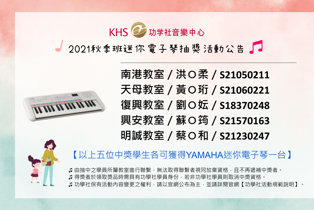 中獎事項說明 ❙ 2021/11/18抽出後,於此網頁與〈功學社音樂Bar〉粉絲團公告中獎名單。(1).由抽中之學員所屬教室進行聯繫,無法取得聯繫者視同放棄資格,且不再遞補中獎者。(2).得獎者於領獎時需具有功學社學員身份,若非功學社學員則取消中獎資格。♫功學社保有活動內容變更之權利,請以本官網公布為主,並請詳閱【功學社活動規範說明(點我)】。
