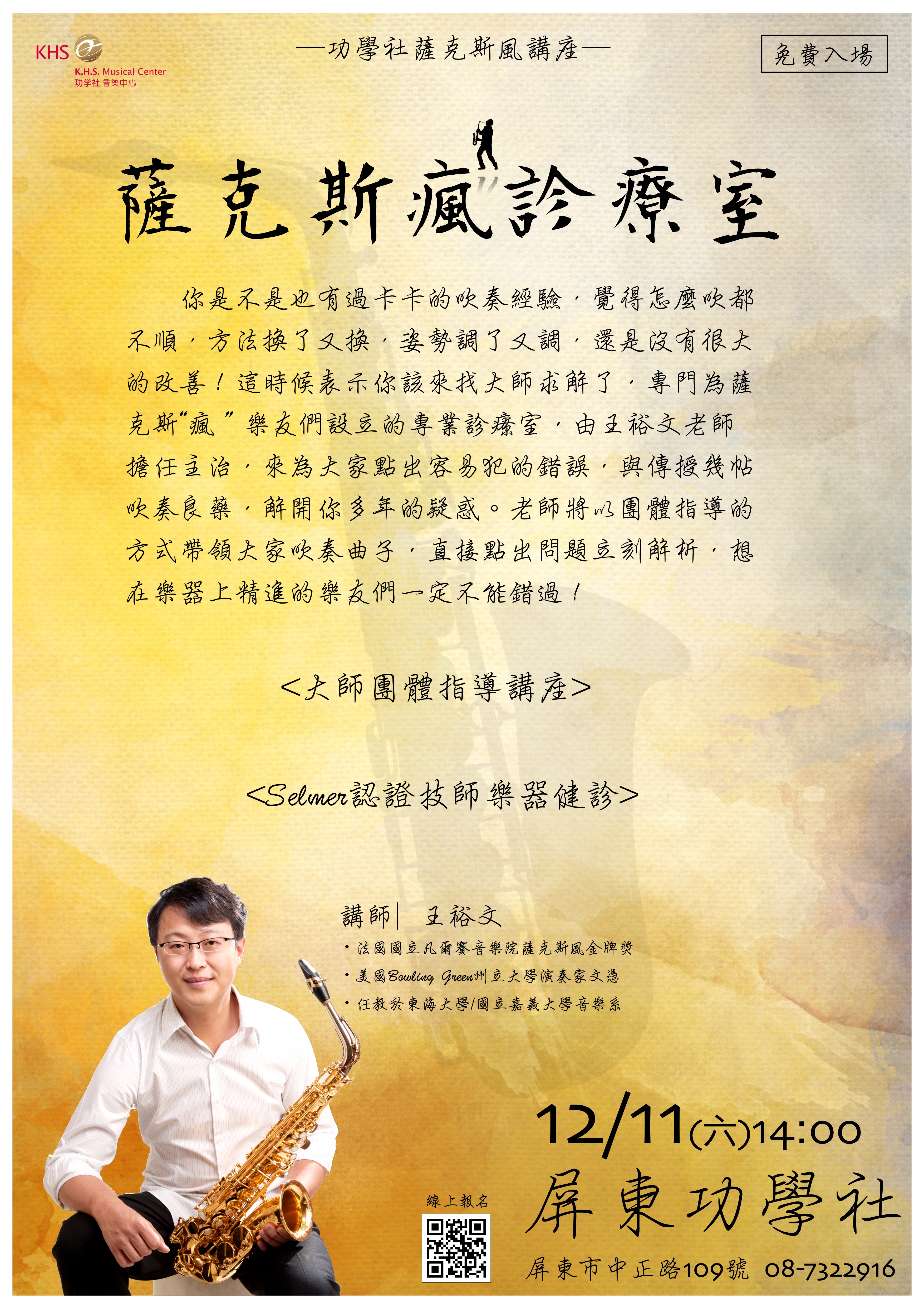 薩克斯"瘋"診療室開始預約!有什麼疑難雜症來屏東功學社就對了! 你是不是也有過卡卡的吹奏經驗,覺得怎麼吹都不順,方法換了又換,姿勢調了又調,還是沒有很大的改善,這表示你該來找大師求解了!