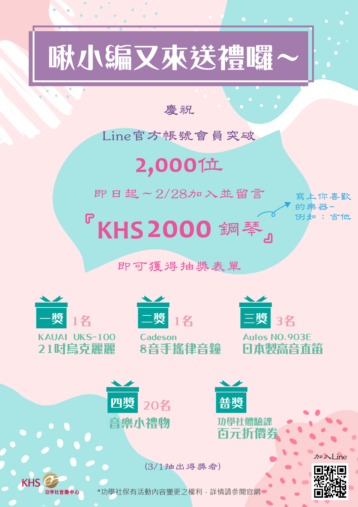 即日起~2/28加入並留言『KHS2000+你喜歡的樂器』,例如: