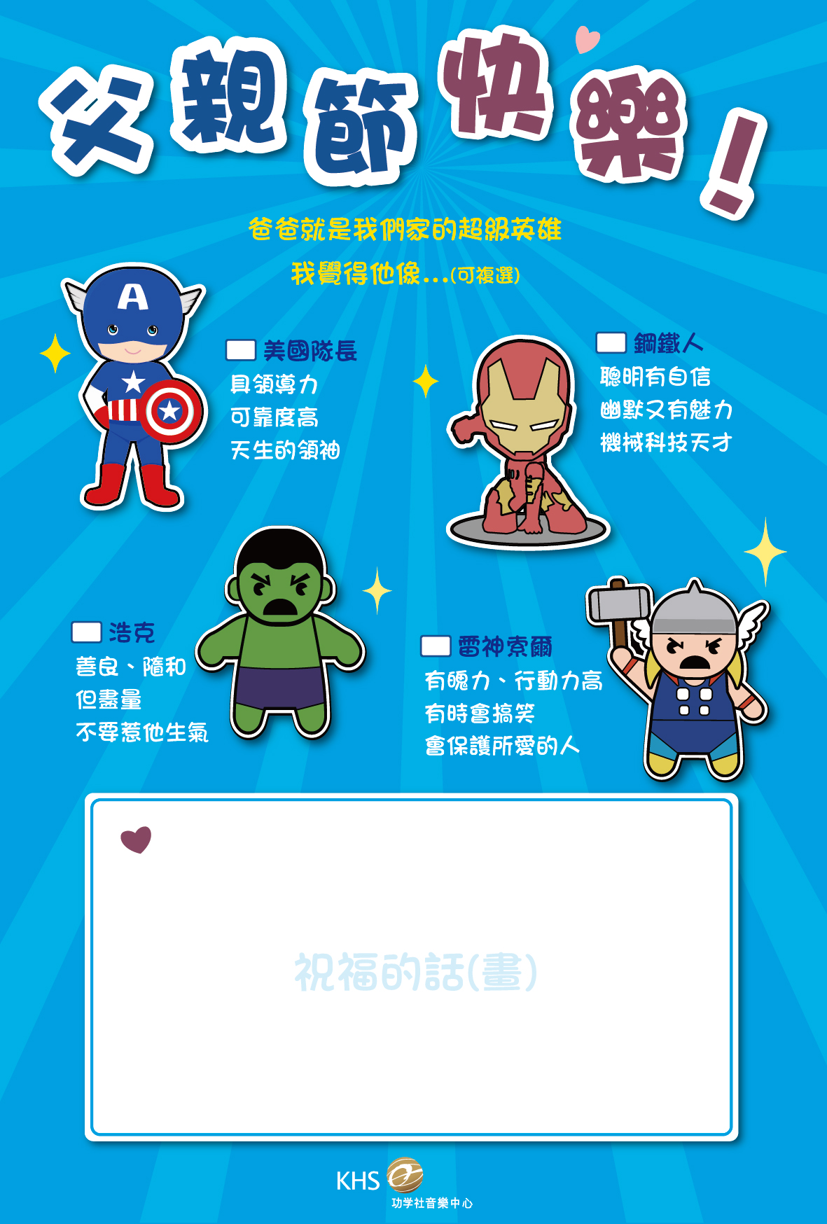 下載父親節『超級英雄卡片』,印出或直接電子檔編輯,寫(畫)下送給爸爸的祝福。