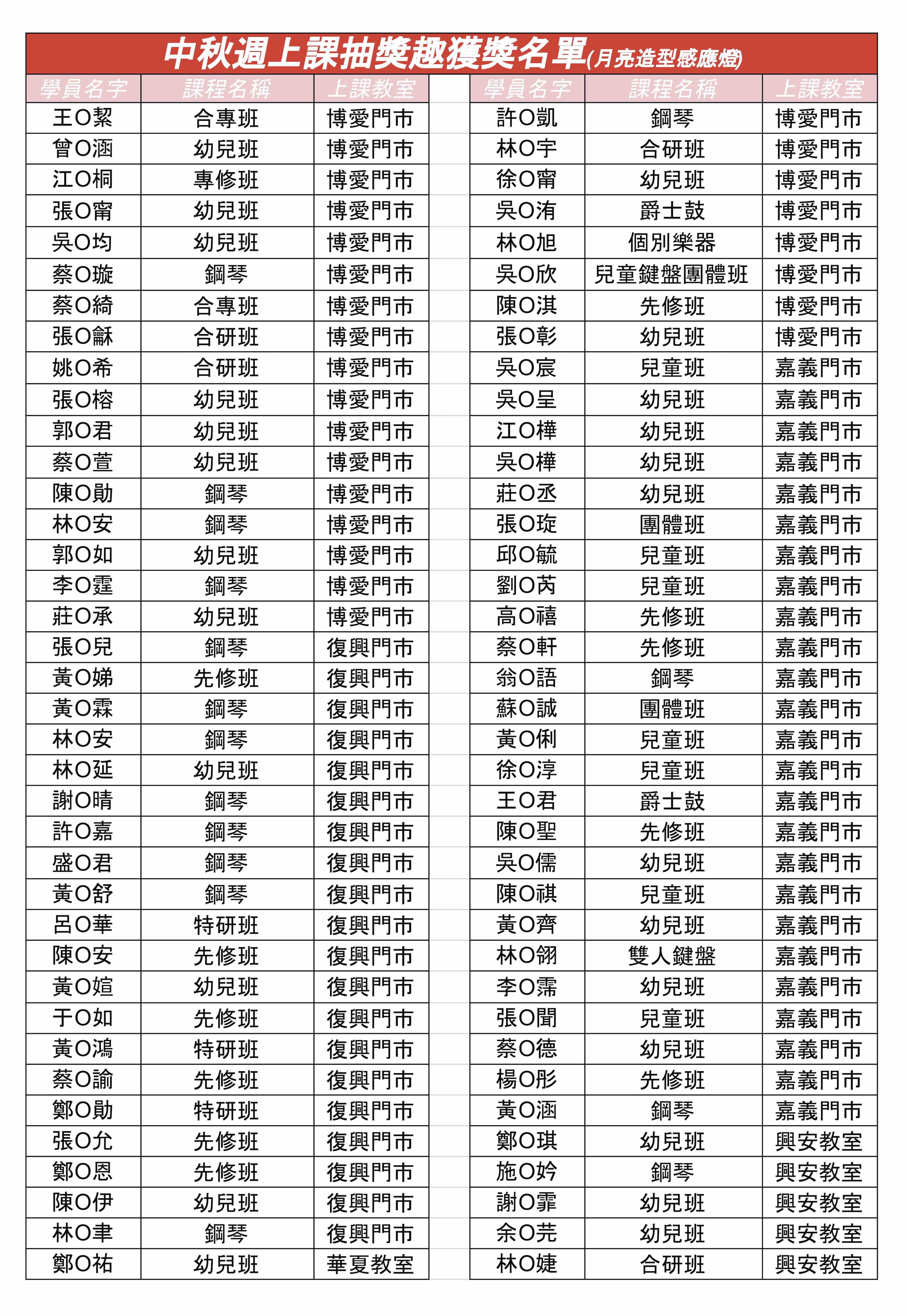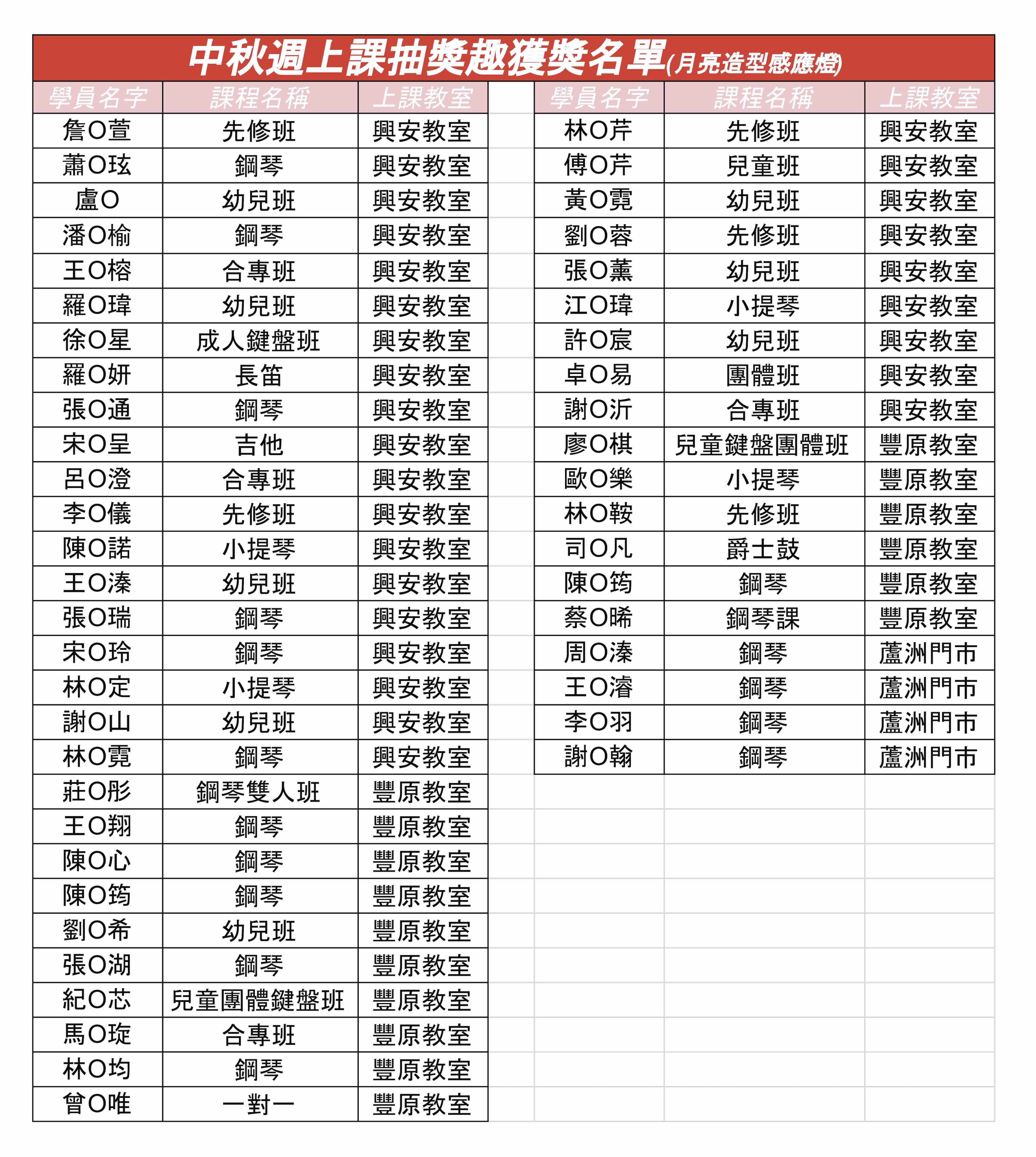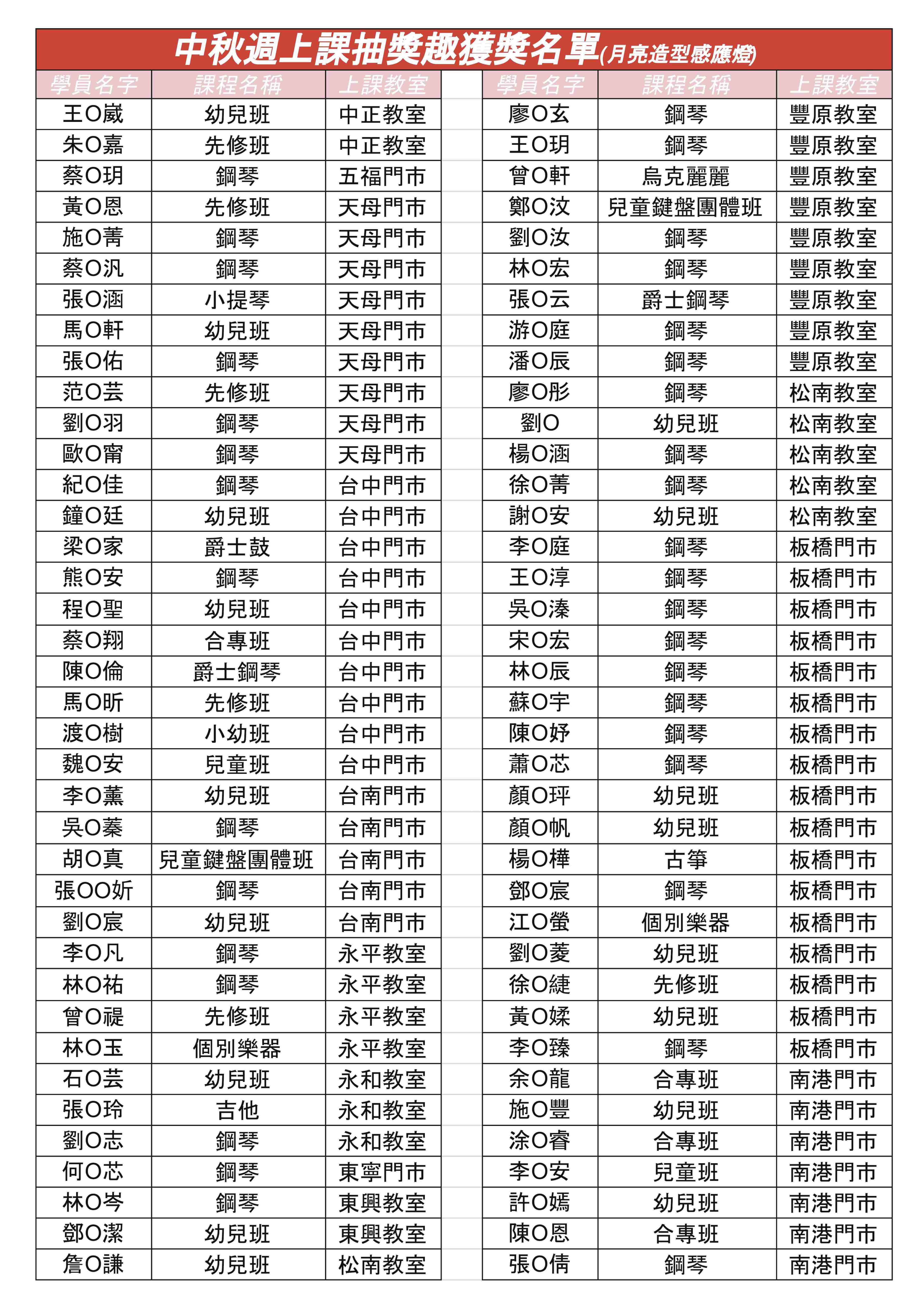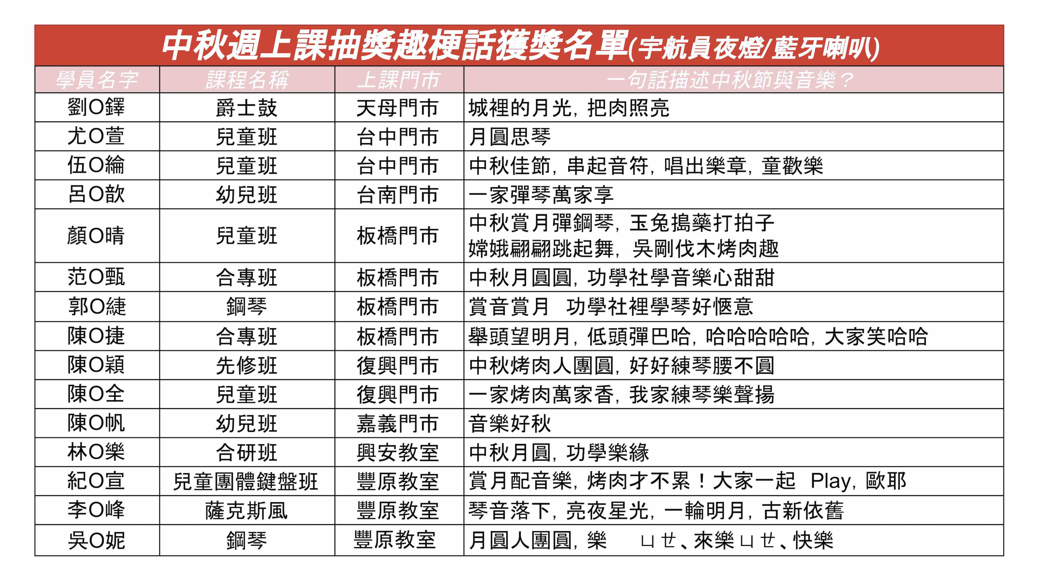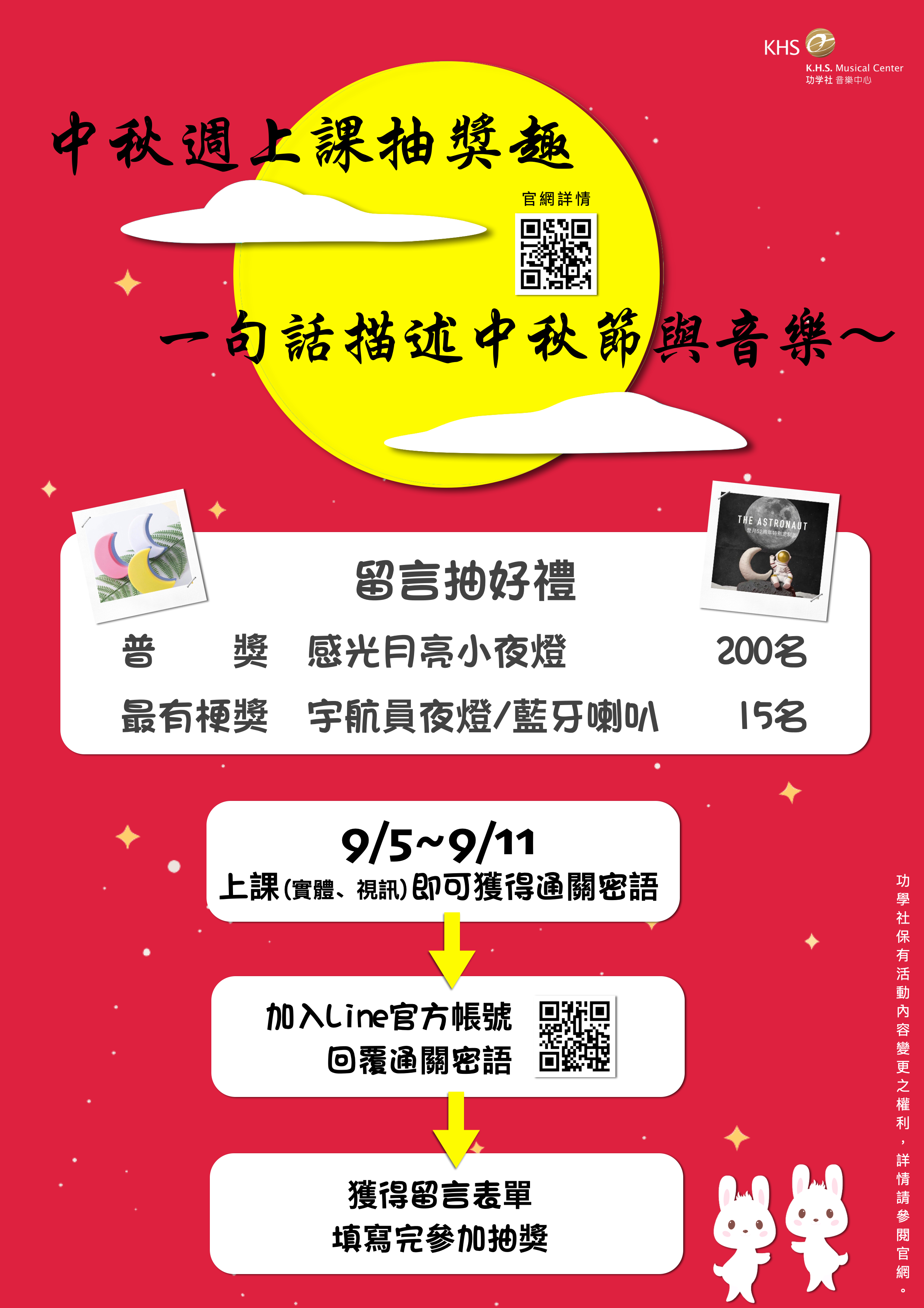 9/5~9/11只要上課(實體or線上)就能參加「中秋週上課抽獎趣」,請向櫃檯老師取得通關密語,並且加入功學社音樂中心LINE官方帳號。
