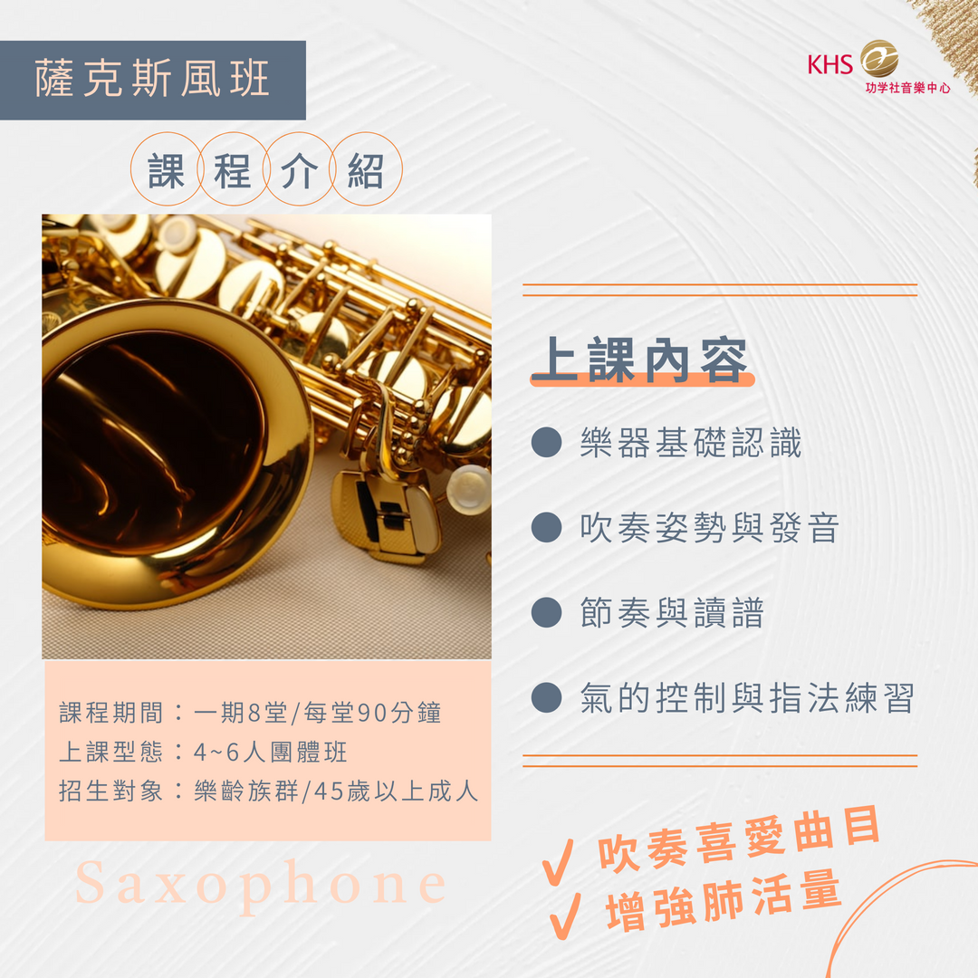 擁有美麗金屬光澤的薩克斯風,音色渾厚嘹亮、餘韻悠長,加上吹奏時的帥氣姿勢,成為近年最受注目樂器之一。薩克斯風入門看似繁複,指法其實與直笛相似,只要透過專業引導,掌握運氣發聲小技巧,薩克斯風其實很簡單!