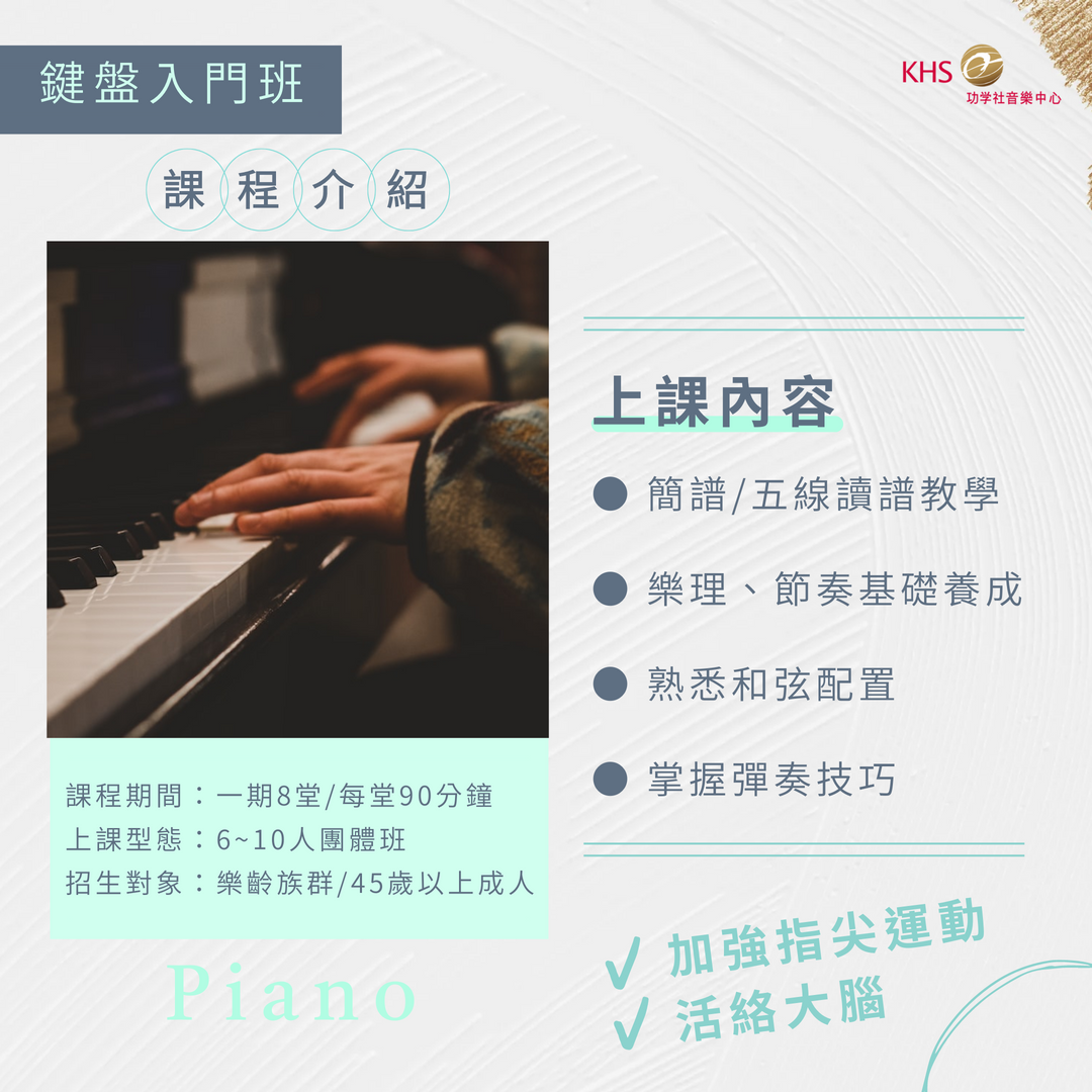 黑白相間的迷人外表,豐富的寬廣音域,音色多元變化豐富,可以表達各種不同的音樂情緒;運用雙手配合演奏,無論是旋律進行或和聲伴奏,都有其獨特魅力。學得早不如學得巧,拾起過去的音樂夢,透過循序漸進的學習,體驗自己彈奏的樂趣,年紀再大都能學琴!