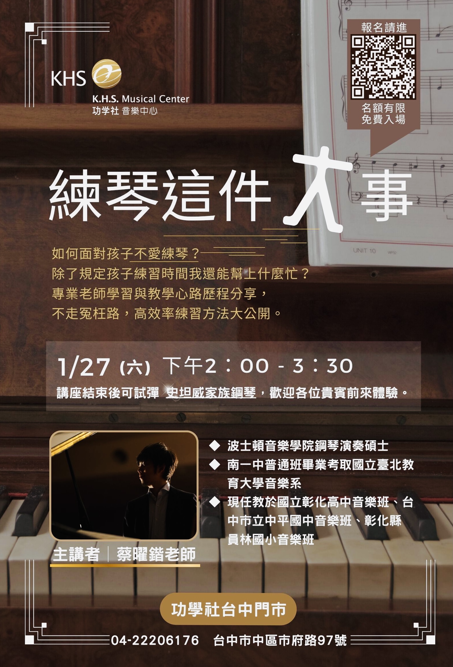 ![]() 主講者│蔡曜鍇老師 | 國立臺南一中畢業,以非音樂班之姿考取國立臺北教育大學音樂系。後獲曼哈頓音樂學院、德州大學奧斯汀分校、波士頓大學等校之鋼琴演奏碩士學位入學許可。畢業於波士頓音樂學院,取得鋼琴演奏碩士學位。 現任教於國立彰化高中音樂班、台中市立中平國中音樂班、彰化縣員林國小音樂班,並經常性擔任民間音樂比賽評審。學生於升學考試、全國學生音樂比賽、各民間音樂比賽皆獲佳績。 |