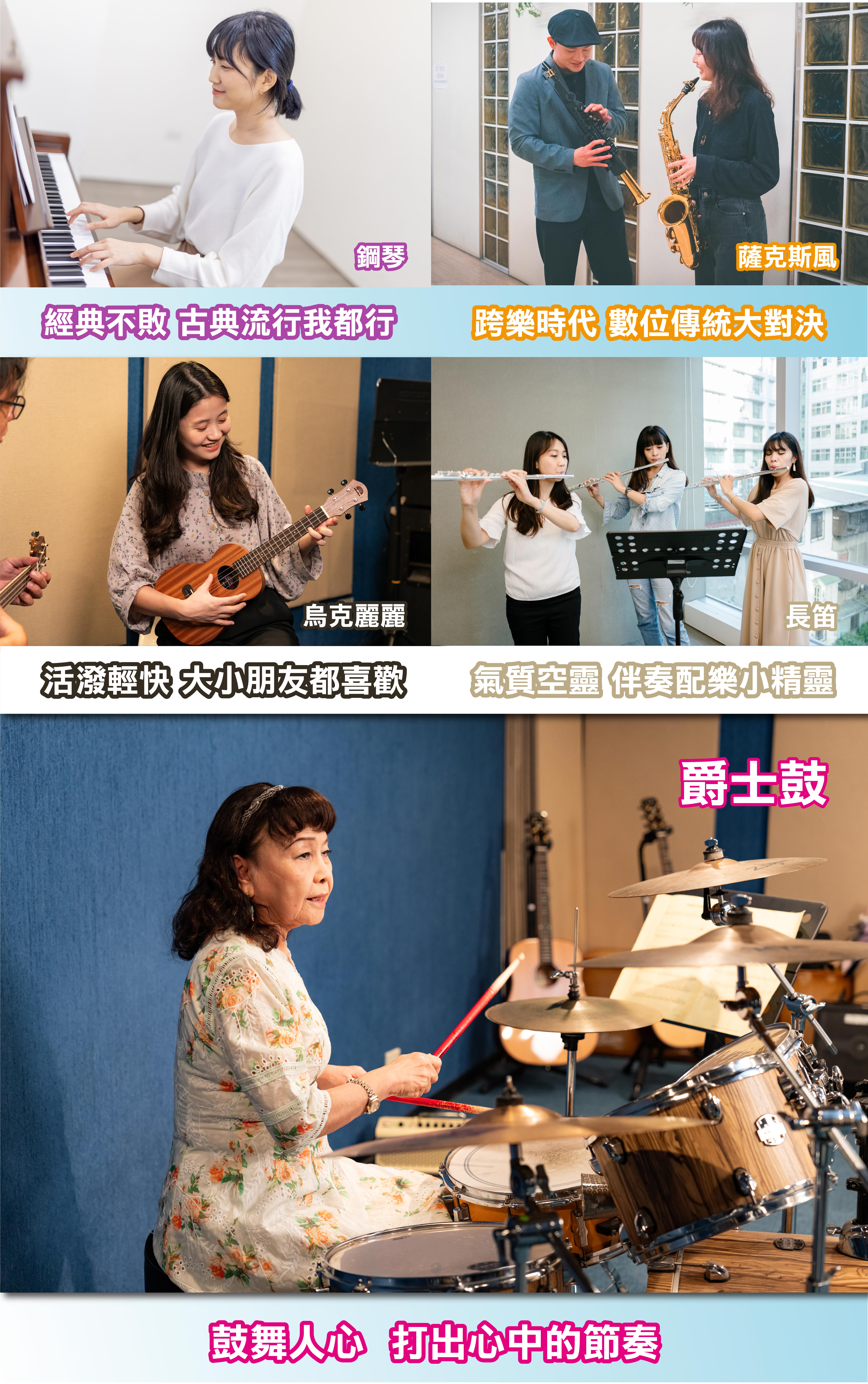 我們提供古典鋼琴、流行鍵盤、薩克斯風、爵士鼓、
