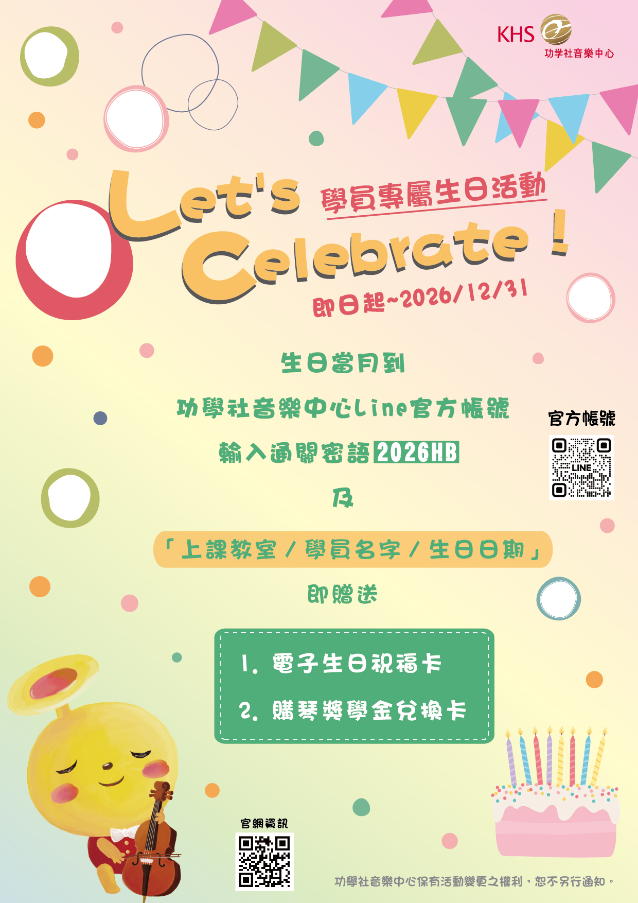 學員只要在生日「當月」到功學社音樂中心Line官方帳號