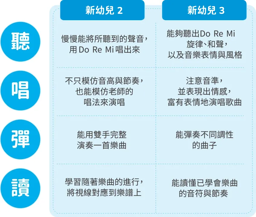 孩子能聽、唱、彈並感受音樂,培養良好的音感、節奏感與自信的音樂表達能力。