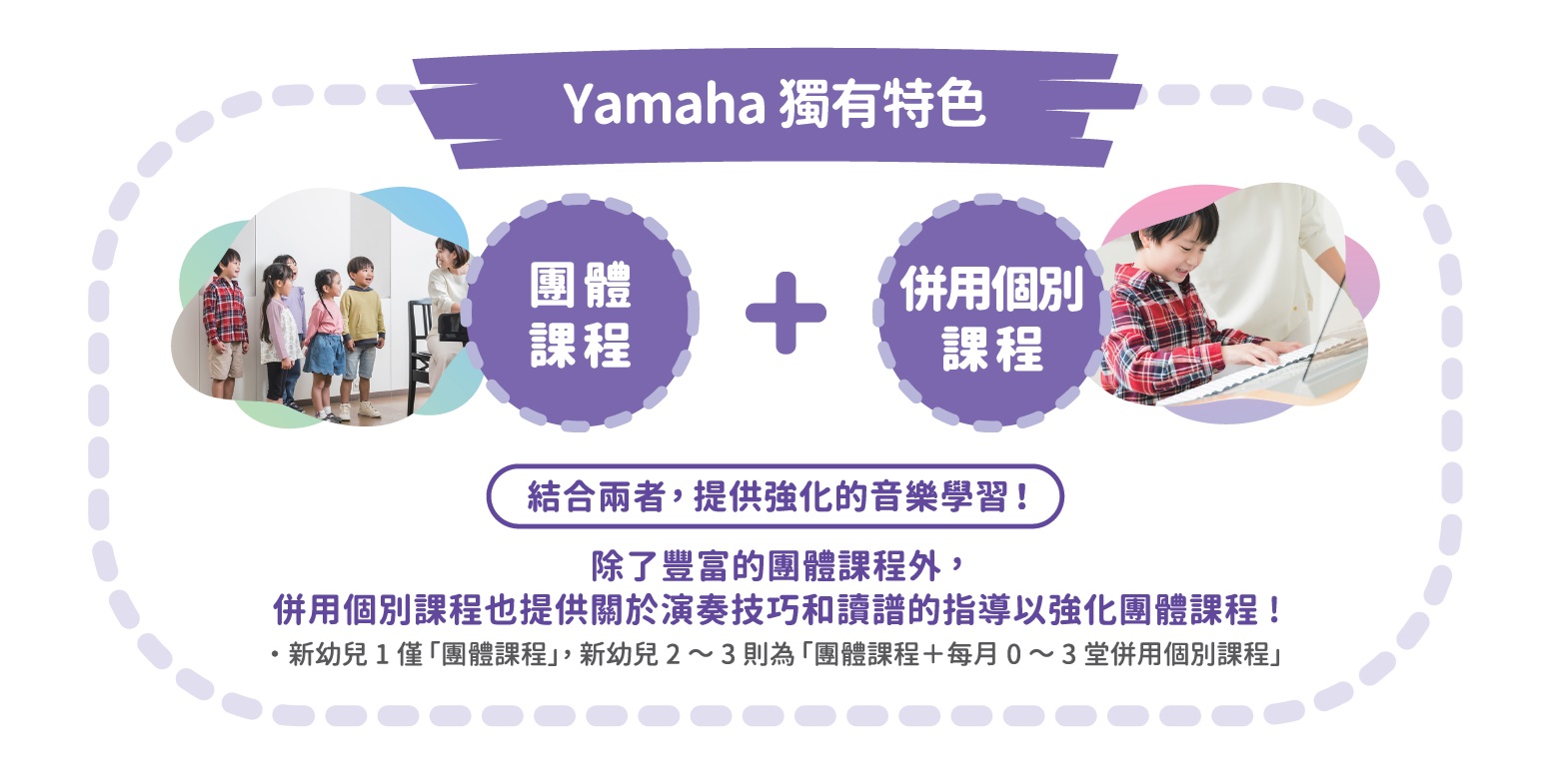 YAMAHA新幼兒班課程結合「團體課」與「併用個別課」,除了團體課特有的合奏與演出經驗,併用個別課程則提供符合每位孩子程度的細緻指導,讓孩子的個性與音樂能力都能被充分發揮。