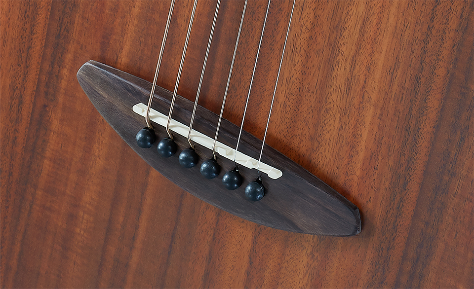 硬度較高的玫瑰木,能支撐琴的後段琴弦張力。搭配合成牛骨弦枕,質地堅硬清脆,能有效的傳導琴弦的共鳴。
