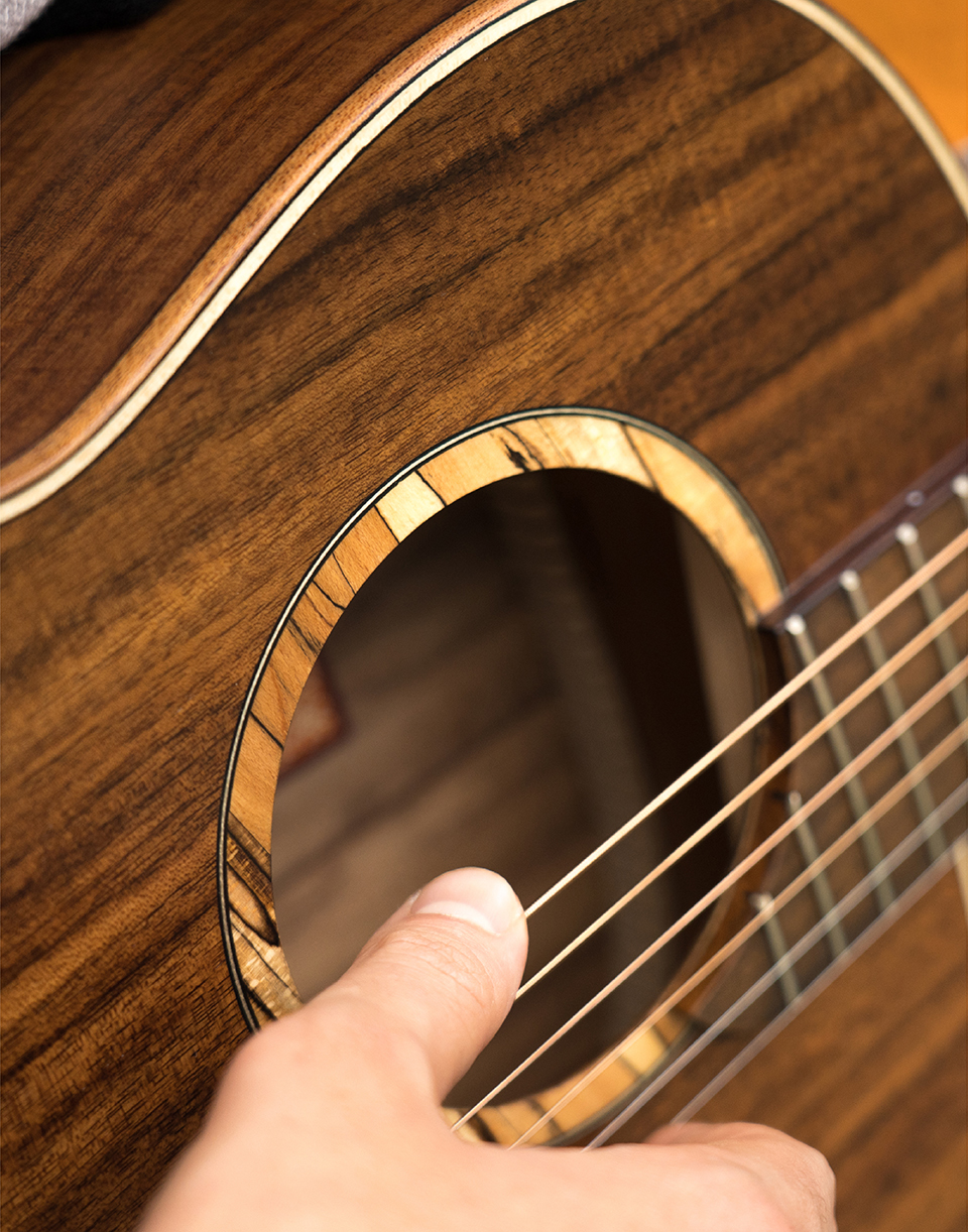 花圈 音孔花圈鑲嵌腐朽楓木,增添層次與細節。 | 鑲邊 桃花心木鑲嵌琴身外側,美觀及保護功能兼具。 |