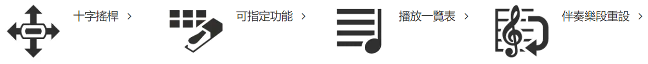 ![]() | 組合伴奏類型 伴奏由許多樂器聲部組成,例如鼓、貝斯、吉他、鋼琴等。在組合伴奏類型中,您可以輕鬆探索、試聽和組合任何伴奏的聲部,創作屬於您的個人伴奏。 | ![]() | 播放一覽表和面板設定記憶 播放一覽表是全新的便利功能,可讓您快速設定樂器。整合登錄記憶至便利的演奏清單,讓您演奏時可立即取用。不論您的曲目多麼龐大,播放一覽表都讓您輕鬆管理和取用樂曲和相關設定。 |