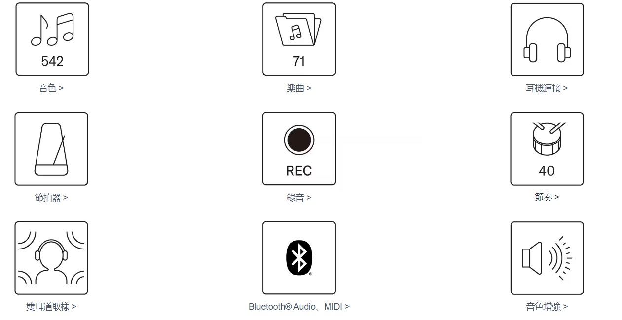 - 觸感近似於平台鋼琴的演奏觸感542 種不同的音色