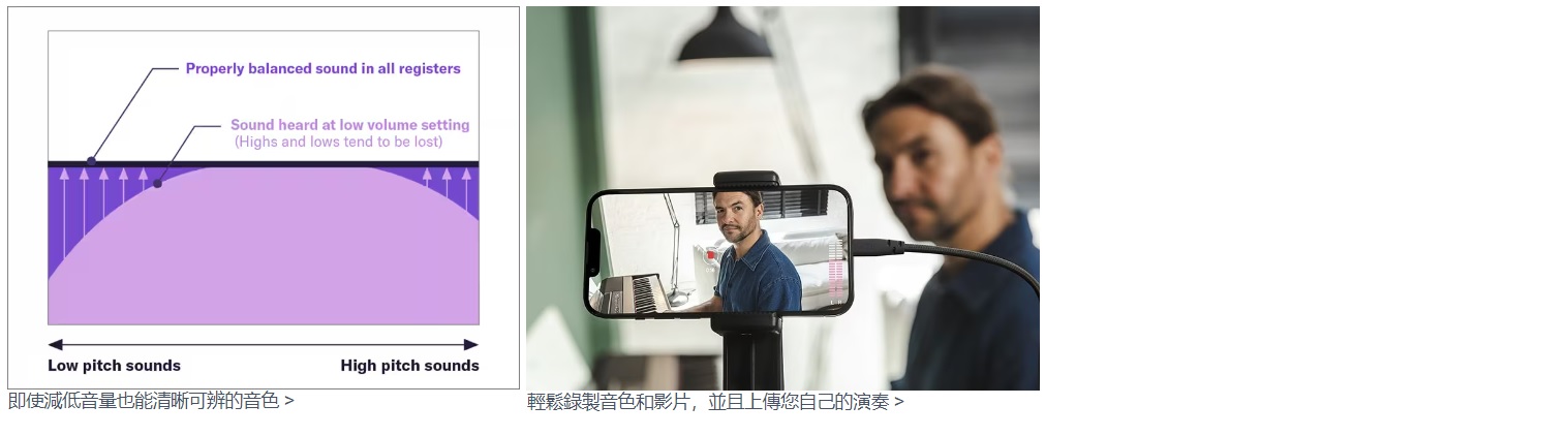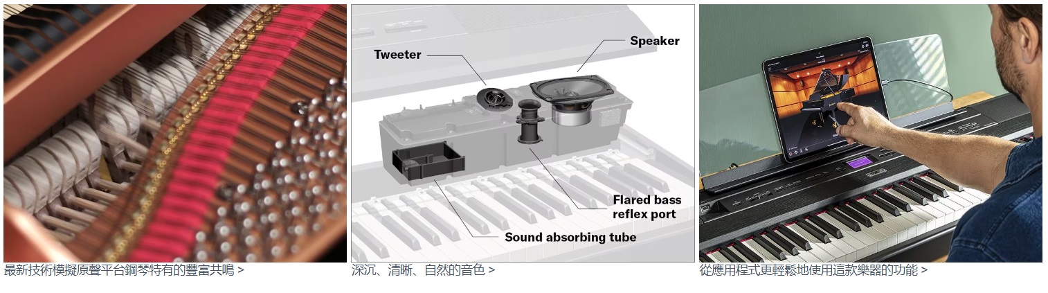 其他功能包括音色增強和可調整的 EQ 設定,當與樂隊的其他樂器搭配演奏時,仍可以清晰聽見數位鋼琴的音色。