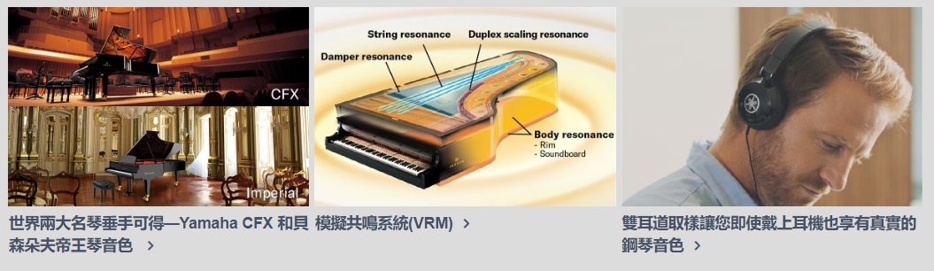 ![]() | 音質 模擬共鳴系統對由樂器的琴弦和琴身產生的交感共鳴進行即時複製,成就真正的平台鋼琴優美音質的基礎。 此外,最新的聲學設計技術可為您的家帶來逼真的音樂會平台鋼琴音色和共鳴,讓您盡情欣賞。 |