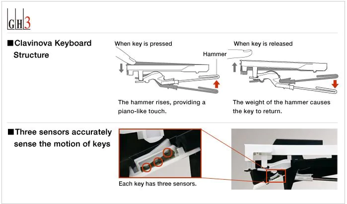 配備著如同平台鋼琴琴槌打擊系統的機械裝置,GH3X鍵盤重現真實鋼琴在彈奏低音位置琴鍵會較為沉重的觸感,以及高音位置較為輕柔的觸鍵感覺。同時還內建三組感應系統,能準確的感應出演奏者所要呈現的聲音細微變化,與彈奏平台鋼琴的觸感非常相似。